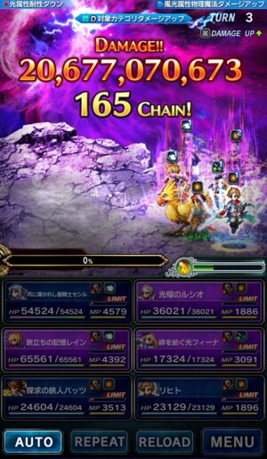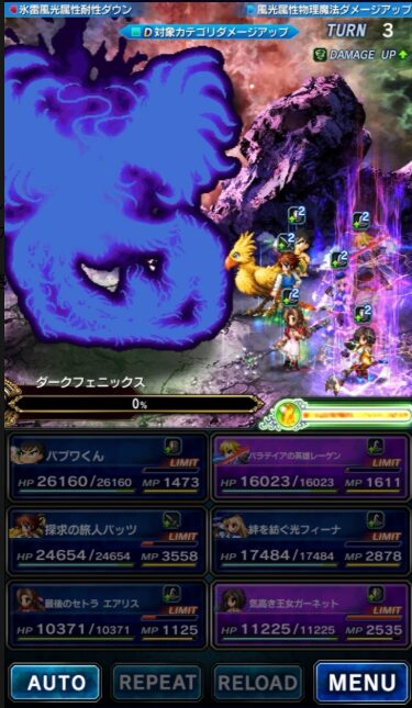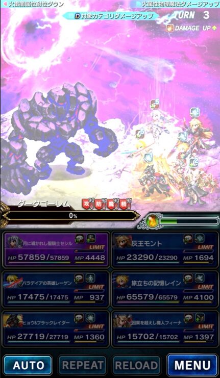 風染めで挑戦。BOSSの弱点が風と闇というのが曲者で、手持ちのキャラ的に編成が難しいのが難点。風PTは、単純に強キャラが少ないし、壁役を用意するのも少し難しい。パラデイアの英雄レーゲンで1ターンだけならその他かばうができるけれど、3ターン撃破が目標だから、どうしても1ターン分、壁役が足らなくなる。仕方ないから、気高き王女ガーネットのバリアやダメージ軽減盛り盛りで凌いだよ(;^ω^) 敵1ターン目と敵2ターン目でそれぞれ、敵エリア展開を上書きされちゃうのも厄介。必然的に敵エリア展開は、3ターン目で行う必要がある。