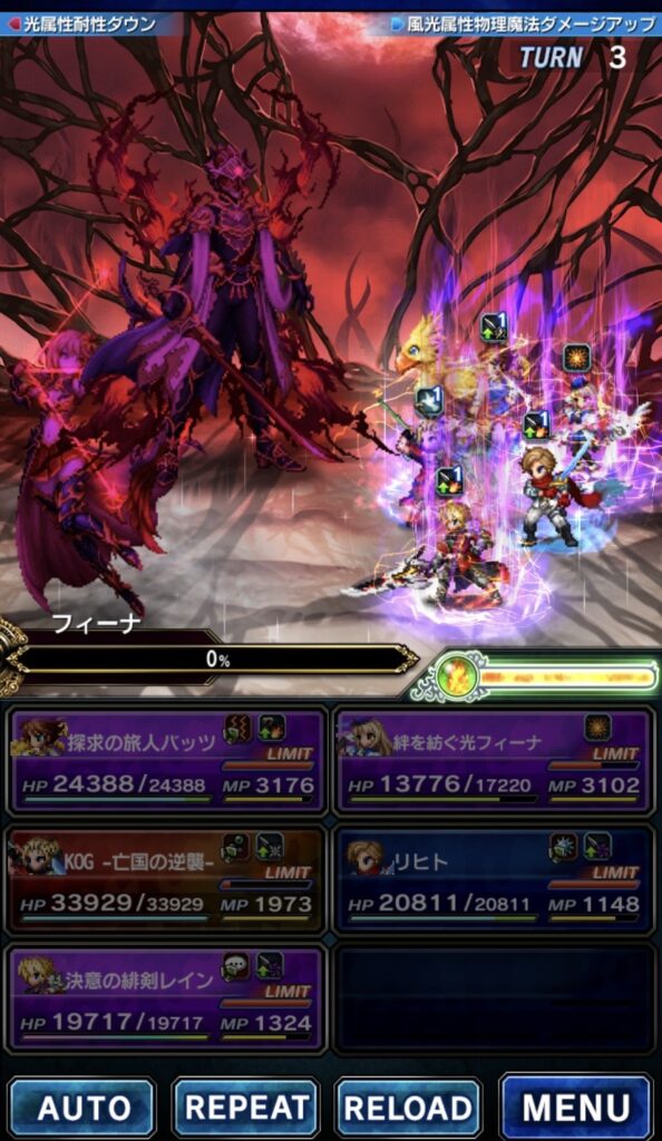 壁役不在がつらいと思いきや、攻魔85%デバフでも、ダメージ軽減とHPバリアで充分凌げる!今回は、絆を紡ぐ光フィーナだけでなく、探求の旅人バッツもいるから、バフ・デバフ・エリア展開の充実っぷりがマシマシなのよねw2人のアシストを受けたKOG亡国の逆襲のLBが強くて嬉しいw