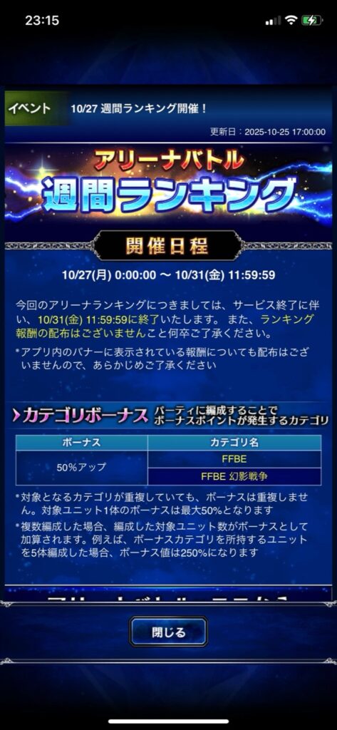 【FFBE】プレイ日記2025/11/13【アリーナバトル(終)】