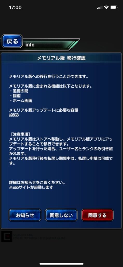 “メモリアル版 移行確認”画面で注意事項を確認し、