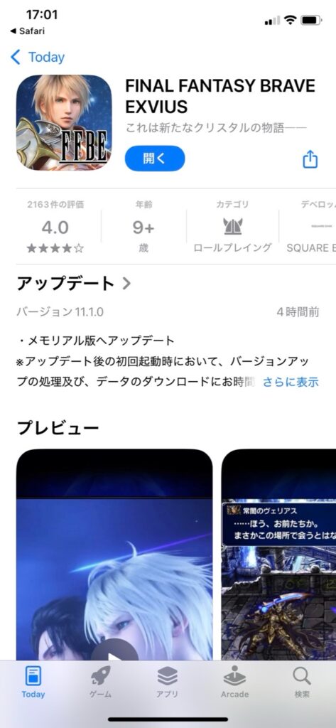 アップデートが終わり次第、”開く”をタップしてFFBEを起動する